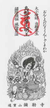 烏枢沙摩明王護符 烏枢沙摩明王(うすさまみょうおう)は、 トイレの神様として知られています。 私たちの一切の汚れ・悪を、烈火で焼き尽くし浄める力があるとされております。特に有名な功徳としては便所の清めがある。便所は古くから「怨霊や悪魔の出入口」と考られ、明王様の炎の功徳によって清浄な場所に変えるといわれます。 また、古来より、心身清浄、安産、小児夜泣き、夜尿症に効くとされております。 お札は、不浄(トイレ)の入口扉の上に張り付けてください。400円 |