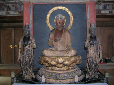 弥勒仏の高さは93.5センチの坐像で今日までは桧木の一木造で左手に宝塔をのせ、結跏趺坐(けっかふざ)し、背ぐりをほどこした内部に塁書名がありそれによりますと、長保元年の造立と記されておりますが、平成の大修復で、材質は三尊とも榧の一木造で左手を膝前に伏せた触地(そくち)印あるいは降魔(ごうま)印であることが判明致しました。この彌勒仏は性空上人が仏師、安鎮に命じて刻ませたということです。 弥勒三尊はあまり例がなく左脇侍は、大妙相菩薩で像の高さ114センチで榧の一木造で右足に重心をかけて立っておられます。右脇侍は法苑林菩薩で高さ112センチ左脇持よりもわずかに低く左足に重心をかけて立っておられますが、寺伝によると日光、月光とされ、尊名は定かではありません。 いずれの尊像も多少の補修がみられますが製作期の明らかな藤原前期の彫刻として学術的価値の高い尊像とされております |